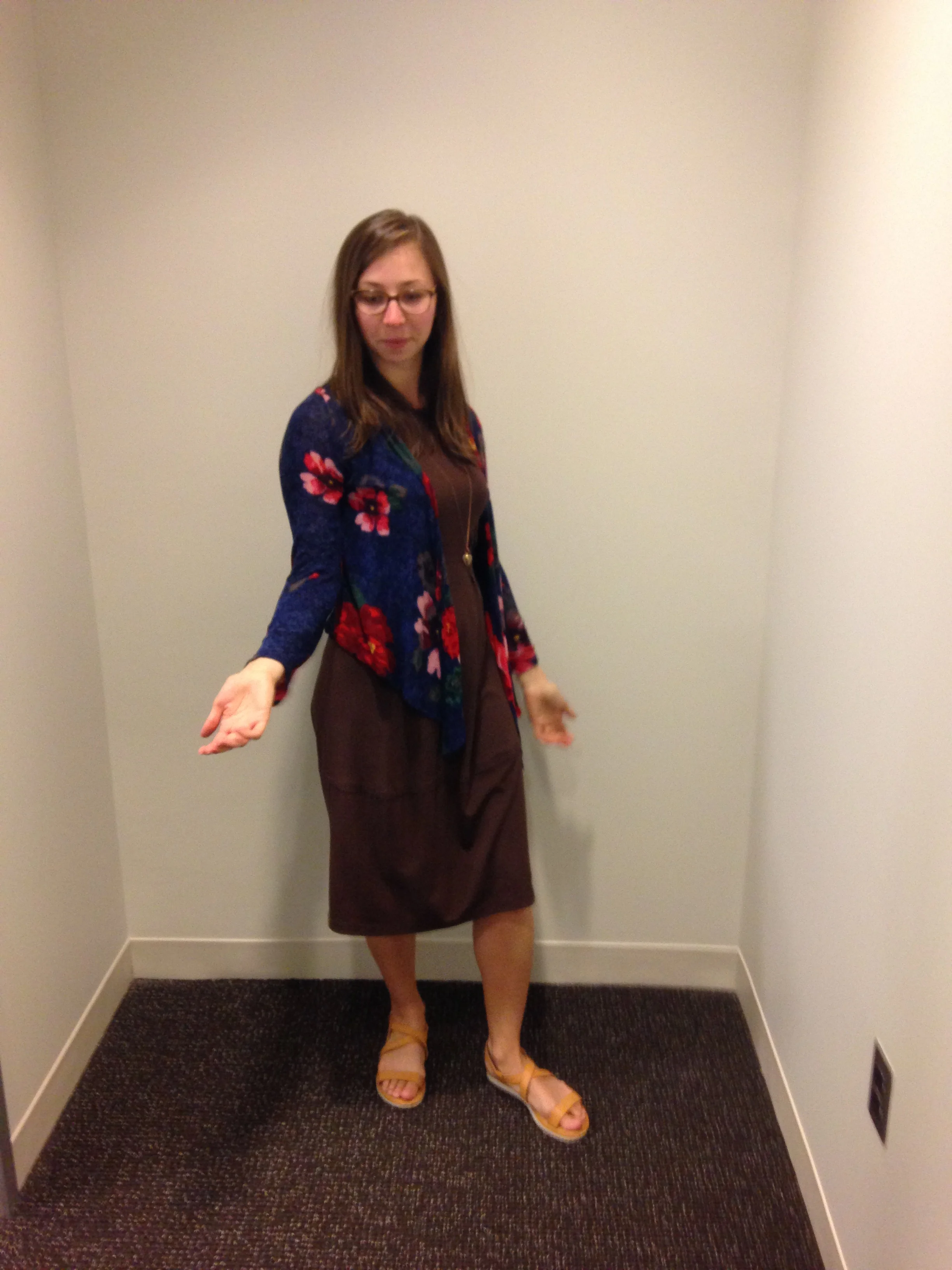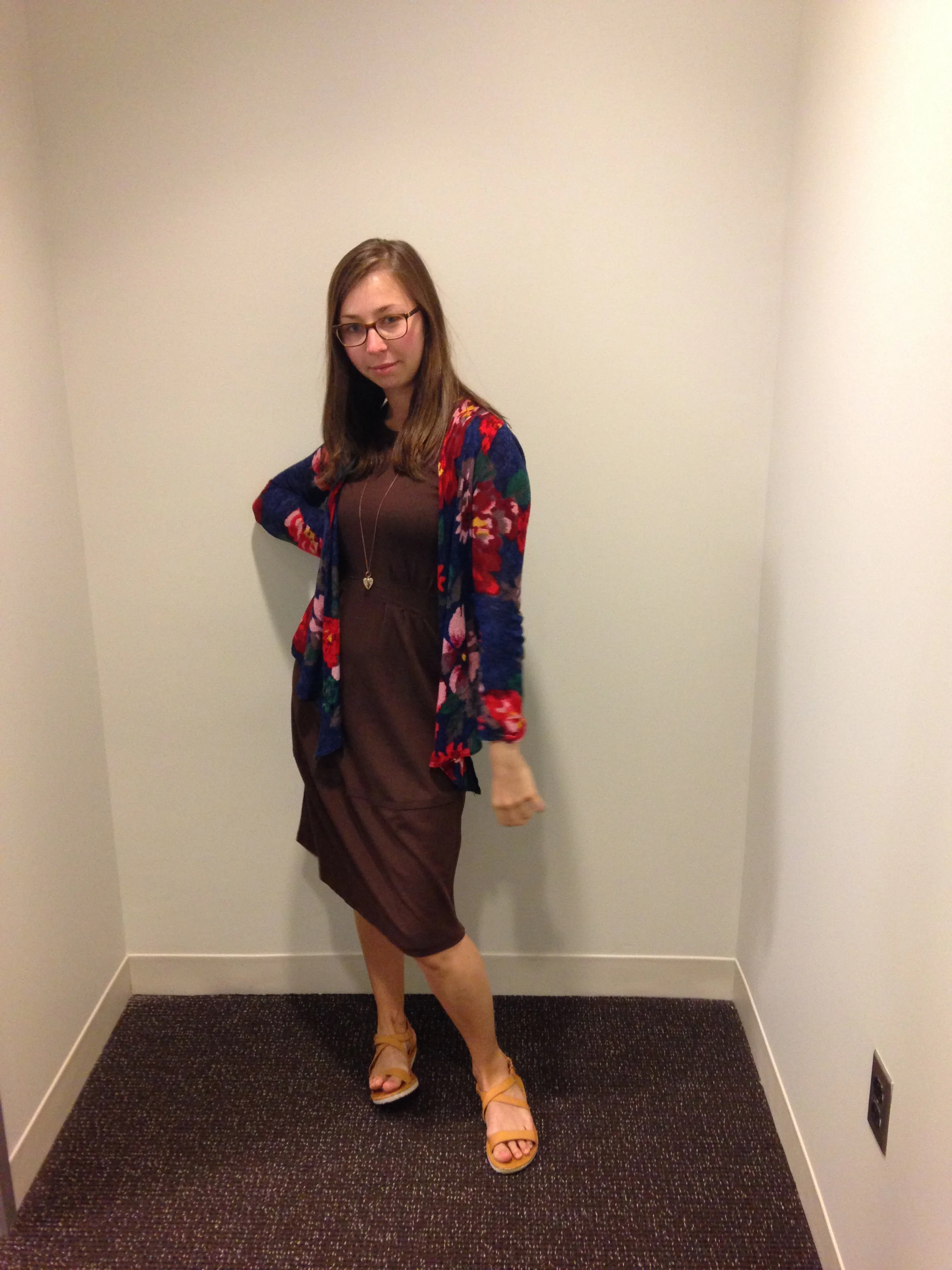I bought this dress in a preppy thrift shop thinking, "This dress is Theory, wearing it will make me work-fashionable". Not the case. You'll notice that in additional to some "flattering" ruching at the waist, there is also a large panel tacked on to the bottom. I and others have wondered whether this was part of Tom Theory's original design or whether it was added later by someone looking to cover up those knees. Either way, it could have done with some heels but I chose to wear the same flat sandals I've worn to work for the past 3 weeks. Also, by adding the floral sweater, I made the dress look like dirt.